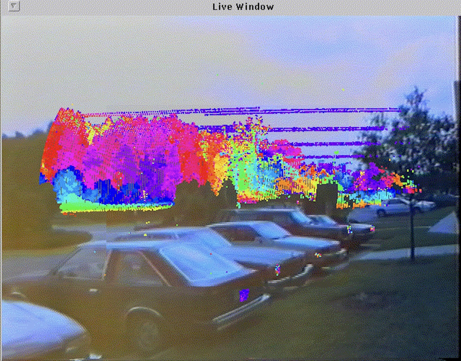 A high-resolution LiDAR overlay taken outside my office at Fibertek in 1993. The purple horizontal lines are power lines about as thick as my thumb just over 1 kilometer away. We combined the raw LiDAR feed with a bunch of other real-time data to help helicopter pilots avoid hazards too small to see.